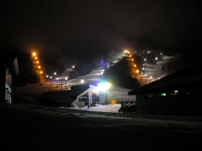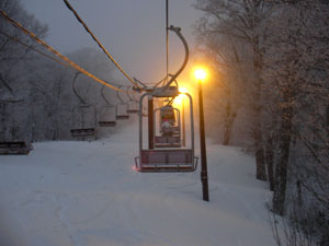 リフトにて。暗くなってきてライトが灯る。